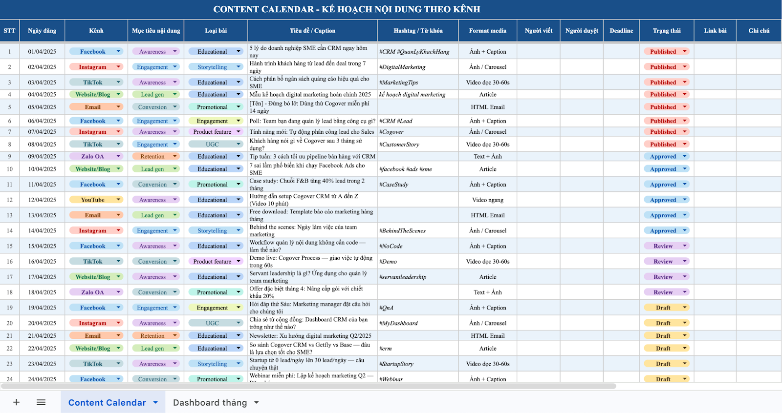 Content calendar là bản kế hoạch hành động cụ thể nhất: ai làm gì, đăng kênh nào, deadline khi nào. Đây cũng là phần dễ bị bỏ lỡ và gây hỗn loạn nhất nếu không có quy trình quản lý rõ ràng. Khi doanh nghiệp triển khai nhiều kênh cùng lúc, việc theo dõi content calendar bằng Excel thường xuyên dẫn đến tình trạng không ai biết bài nào đang chờ duyệt, bài nào đã đăng, bài nào bị trễ deadline.