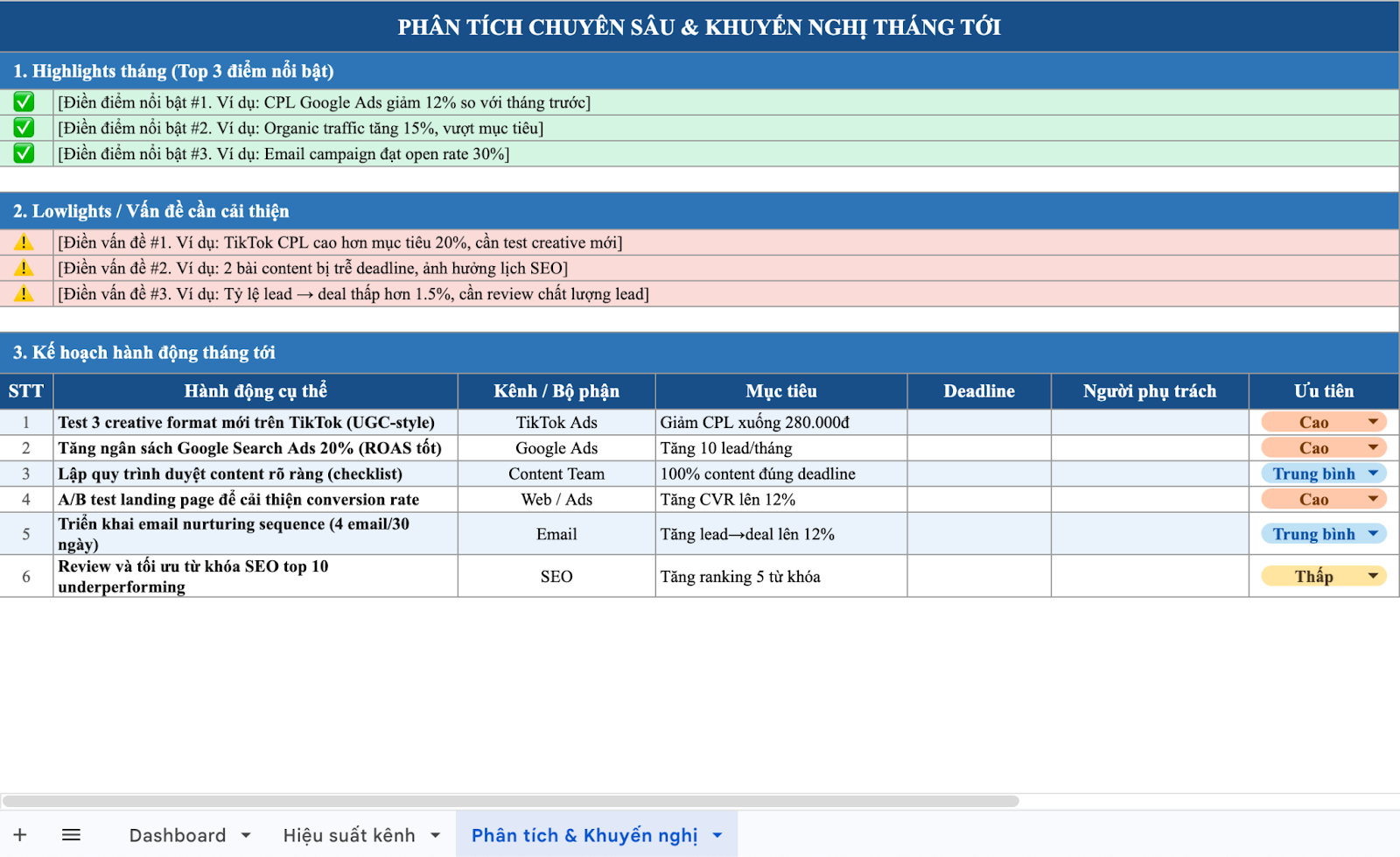 Để giúp người xem dễ dàng nắm bắt thông tin, báo cáo thường được trình bày dưới dạng biểu đồ trực quan. Về định dạng, báo cáo có thể được xây dựng trên Google Slides để phục vụ trình bày dashboard hoặc trên Excel để lưu trữ và phân tích dữ liệu chi tiết. Mẫu báo cáo này đặc biệt phù hợp với Marketing Manager khi cần báo cáo lên CEO hoặc CMO và cung cấp cơ sở dữ liệu cho các quyết định phân bổ ngân sách marketing.