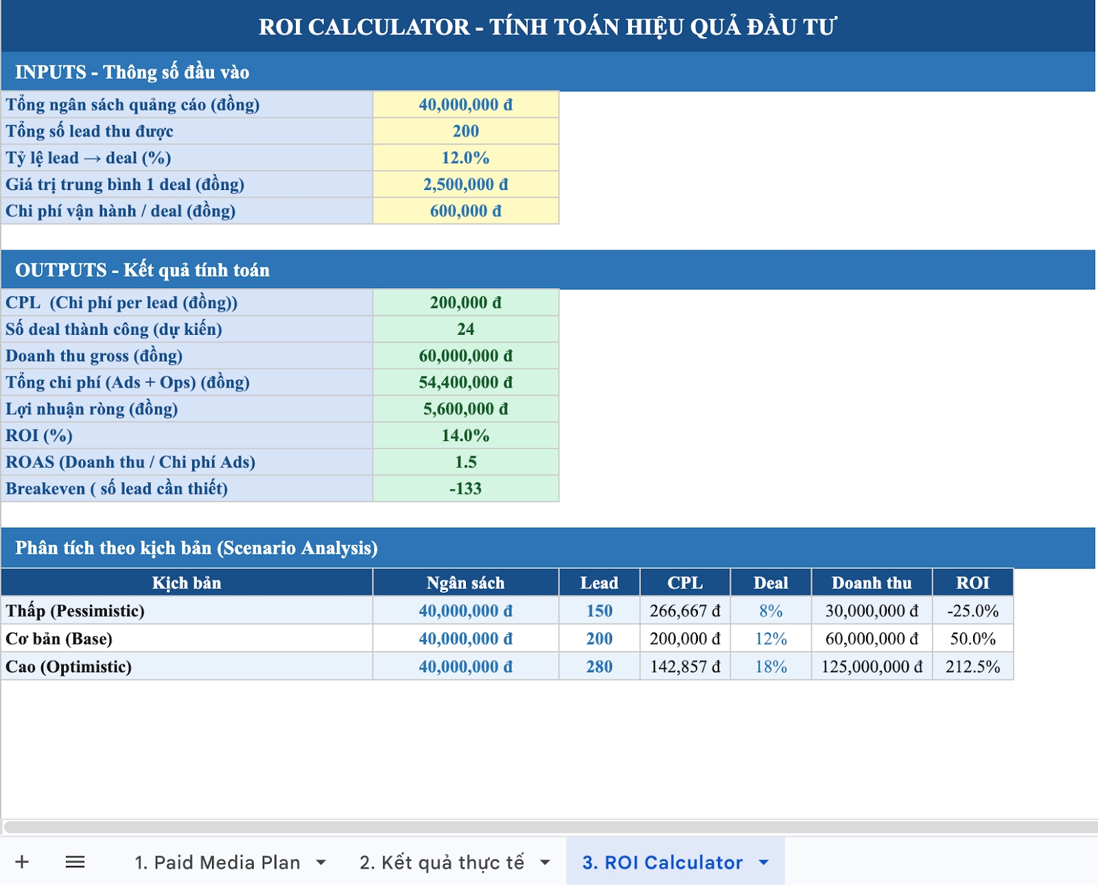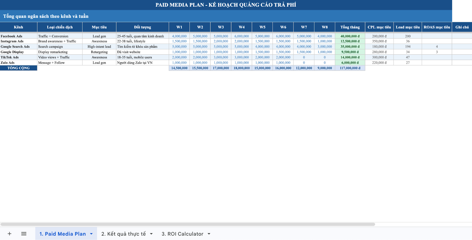 Đồng thời, mẫu kế hoạch còn được tích hợp công thức để tự động tính ROI dựa trên dữ liệu thực tế. Thông thường, mẫu này được thiết kế dưới dạng file Excel với các công thức có sẵn, giúp người dùng chỉ cần nhập dữ liệu thực tế để hệ thống tự cập nhật kết quả. Mẫu kế hoạch này đặc biệt phù hợp với Performance Marketing Manager hoặc các doanh nghiệp có ngân sách quảng cáo từ 20 triệu đồng mỗi tháng trở lên.