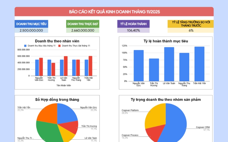 Xây dựng mẫu KPI cho nhân viên sales rõ ràng và đo lường được là nền tảng để doanh nghiệp nâng hiệu suất bán hàng và thúc đẩy tăng trưởng bền vững. Bên cạnh đó, việc giao mục tiêu và đánh giá KPI sẽ trở nên dễ dàng, minh bạch hơn khi ứng dụng phần mềm quản lý như Cogover CRM với khả năng tự động hóa và theo dõi realtime. Khi KPI được quản trị đúng cách, doanh nghiệp không chỉ cải thiện doanh thu mà còn tối ưu được toàn bộ quy trình bán hàng và chất lượng dịch vụ khách hàng.