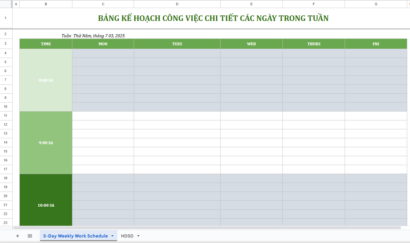 Nếu bạn muốn sắp xếp công việc khoa học và có tầm nhìn tổng thể hơn, hãy thử mẫu kế hoạch làm việc cá nhân theo tuần. Mẫu này giúp bạn xác định rõ nhiệm vụ cho từng ngày, tránh trùng lặp hoặc bỏ sót đầu việc. Việc lập kế hoạch công việc cá nhân theo tuần không chỉ giúp bạn chủ động thời gian mà còn mang lại cảm giác kiểm soát và hiệu quả trong từng giai đoạn làm việc.