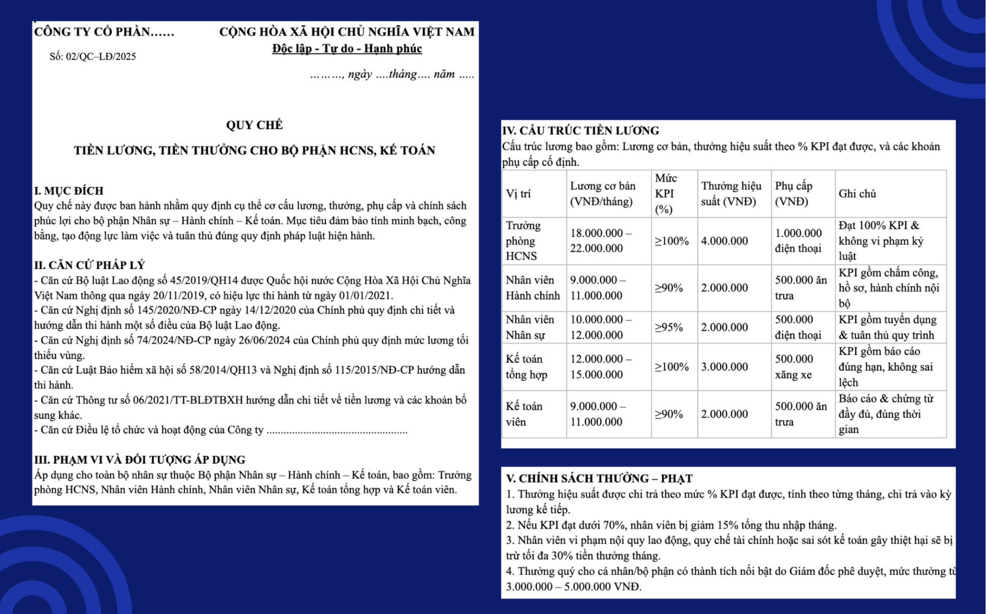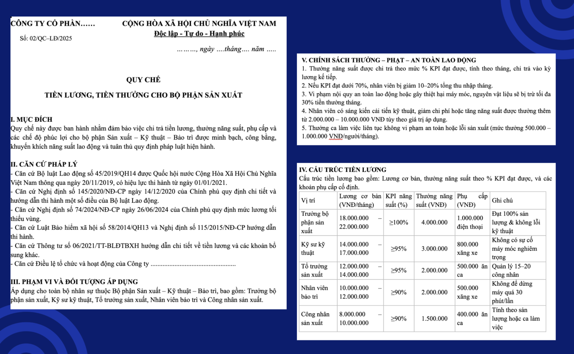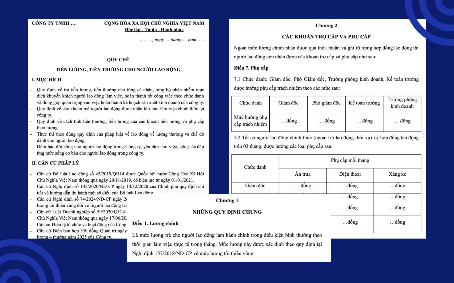 Quy chế lương là nền tảng đảm bảo doanh nghiệp trả lương minh bạch, công bằng và đúng luật. Bài viết này sẽ tổng hợp 9 mẫu quy chế lương, thưởng mới nhất 2025 theo từng loại hình doanh nghiệp (Cổ phần, TNHH, sản xuất, bán lẻ) và từng bộ phận (sales, hành chính, kỹ thuật). Doanh nghiệp có thể tải miễn phí file Word để chỉnh sửa và áp dụng ngay.