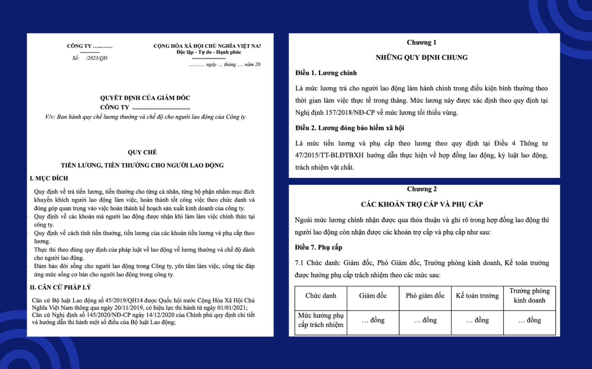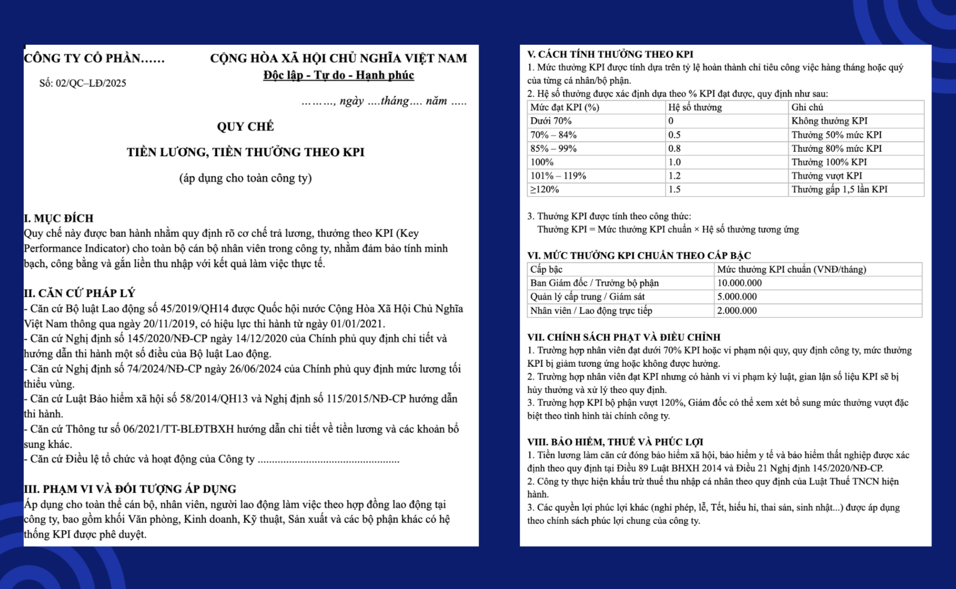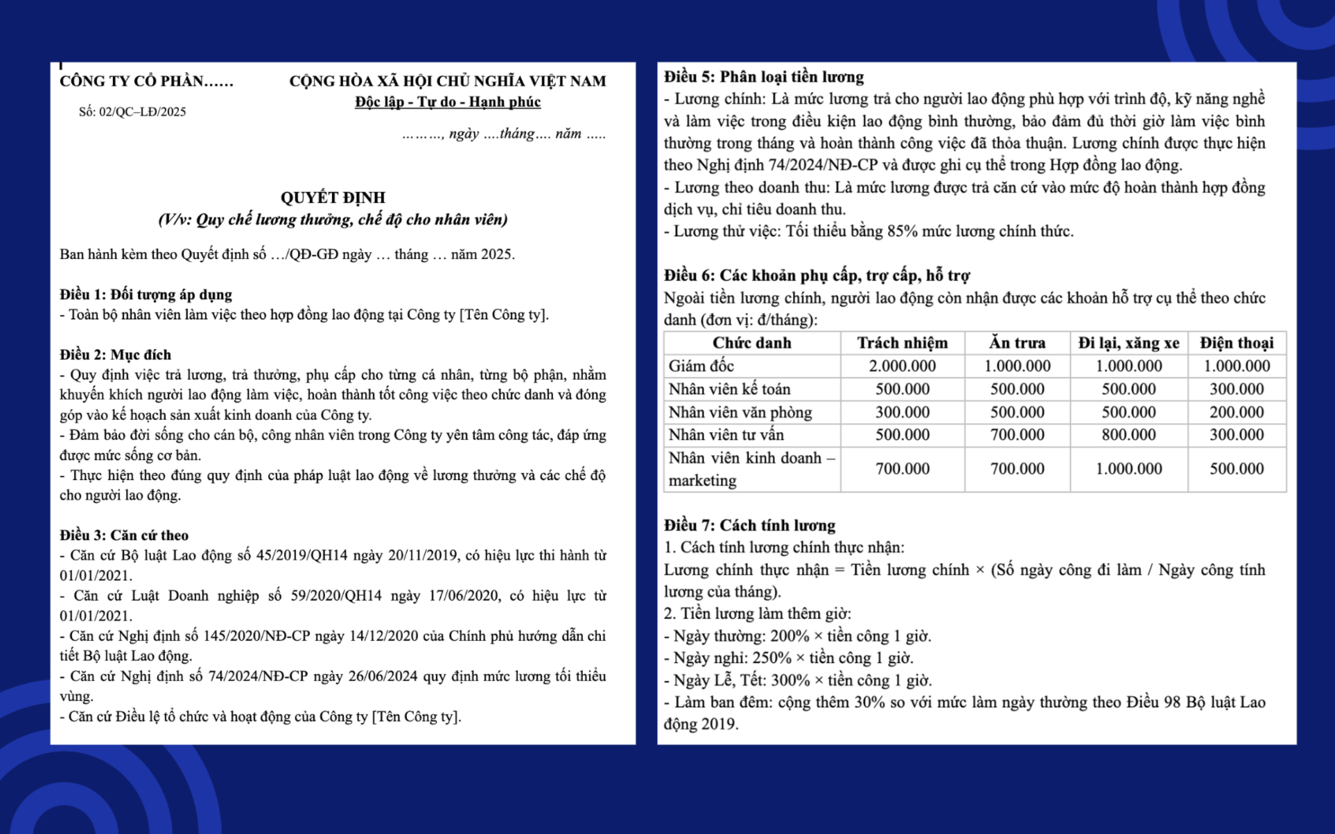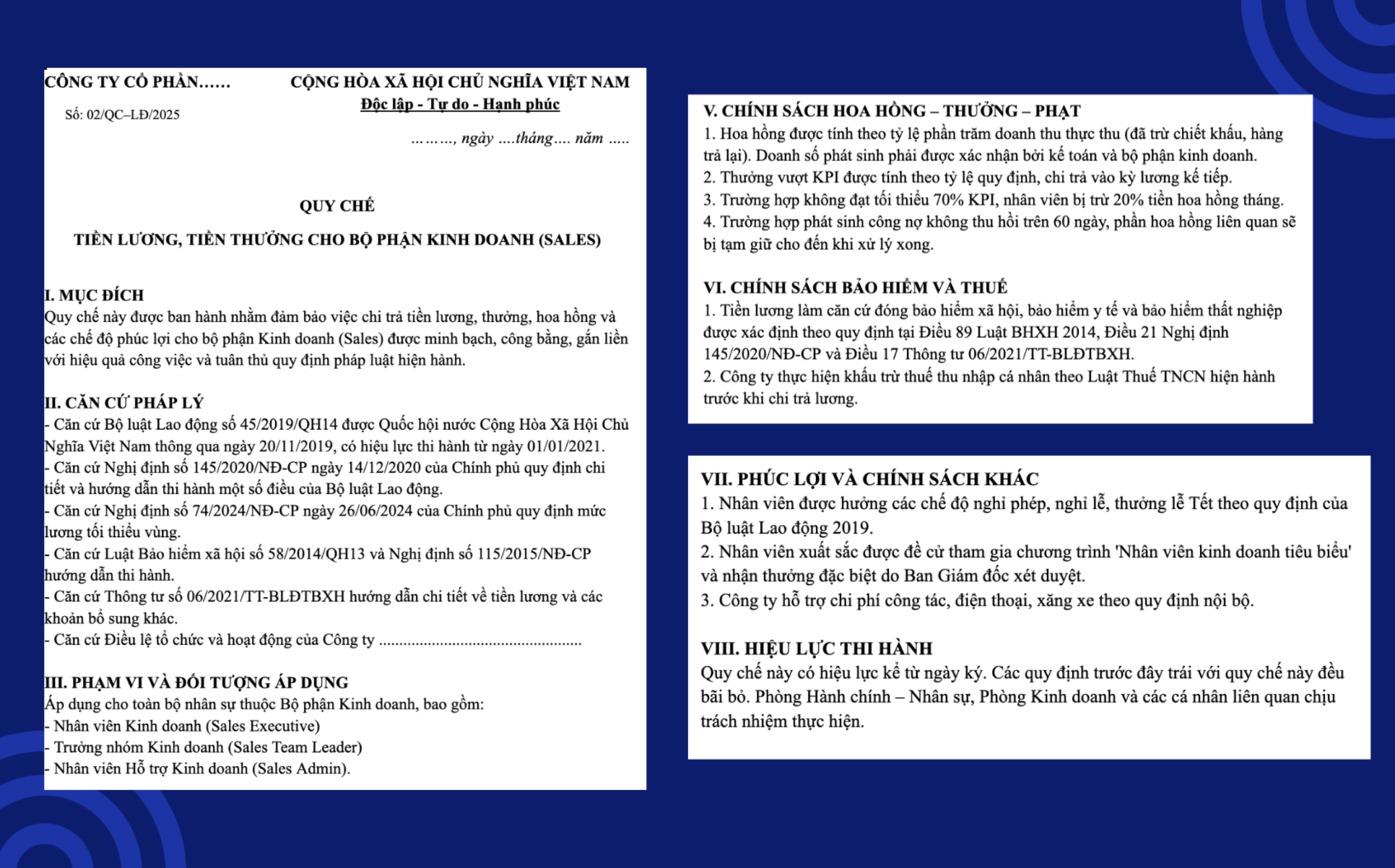 Quy chế lương là nền tảng đảm bảo doanh nghiệp trả lương minh bạch, công bằng và đúng luật. Bài viết này sẽ tổng hợp 9 mẫu quy chế lương, thưởng mới nhất 2025 theo từng loại hình doanh nghiệp (Cổ phần, TNHH, sản xuất, bán lẻ) và từng bộ phận (sales, hành chính, kỹ thuật). Doanh nghiệp có thể tải miễn phí file Word để chỉnh sửa và áp dụng ngay.