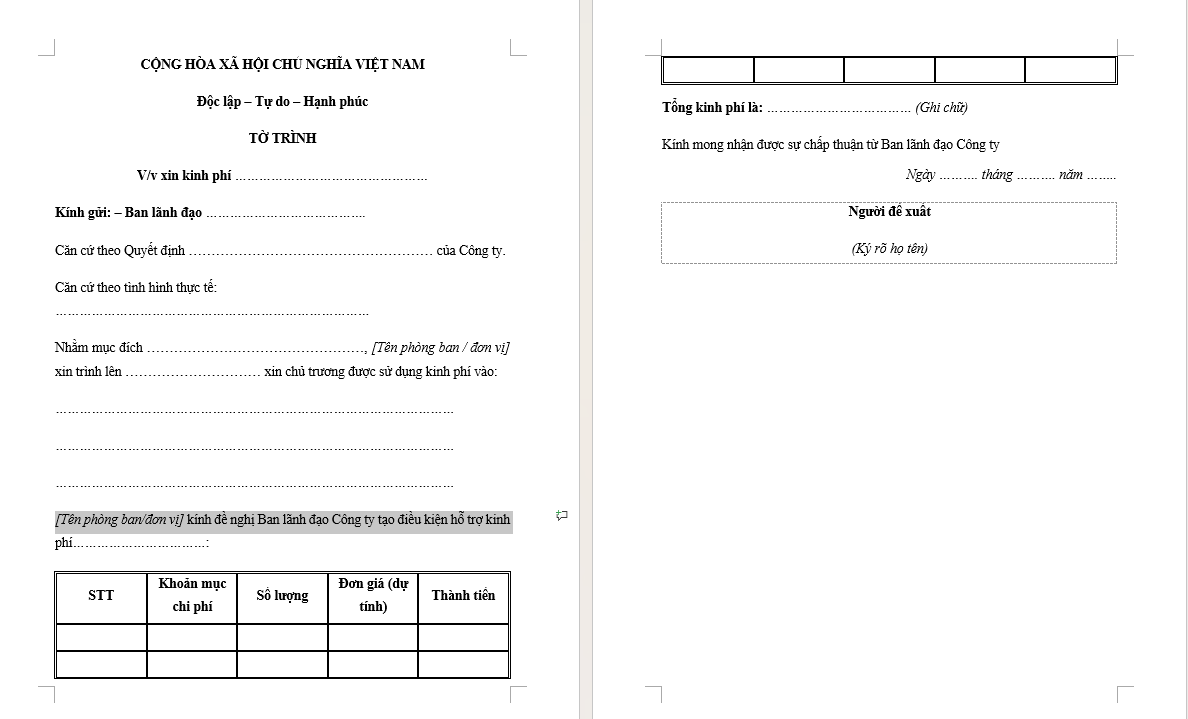 Dưới đây là một số mẫu tờ trình xin kinh phí thường được sử dụng trong doanh nghiệp, tùy theo mục đích và nhu cầu cụ thể của từng bộ phận. Mỗi mẫu tờ trình sẽ có nội dung và hình thức trình bày khác nhau, nhưng đều hướng đến mục tiêu chung là đề xuất, xin phê duyệt và sử dụng ngân sách một cách hợp lý. Việc nắm rõ từng loại tờ trình giúp người làm dễ dàng lựa chọn biểu mẫu phù hợp, đồng thời đảm bảo quy trình xin kinh phí diễn ra nhanh chóng, minh bạch và hiệu quả.
