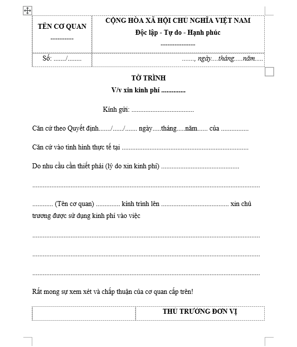 Mẫu tờ trình xin kinh phí là văn bản hành chính được sử dụng để đề nghị cấp trên, cơ quan tài chính hoặc ban quản lý phê duyệt khoản chi cho một hoạt động, dự án hay nhu cầu cụ thể. Văn bản này thể hiện mục đích sử dụng kinh phí, số tiền đề xuất, nguồn chi, và các căn cứ để xin cấp kinh phí.