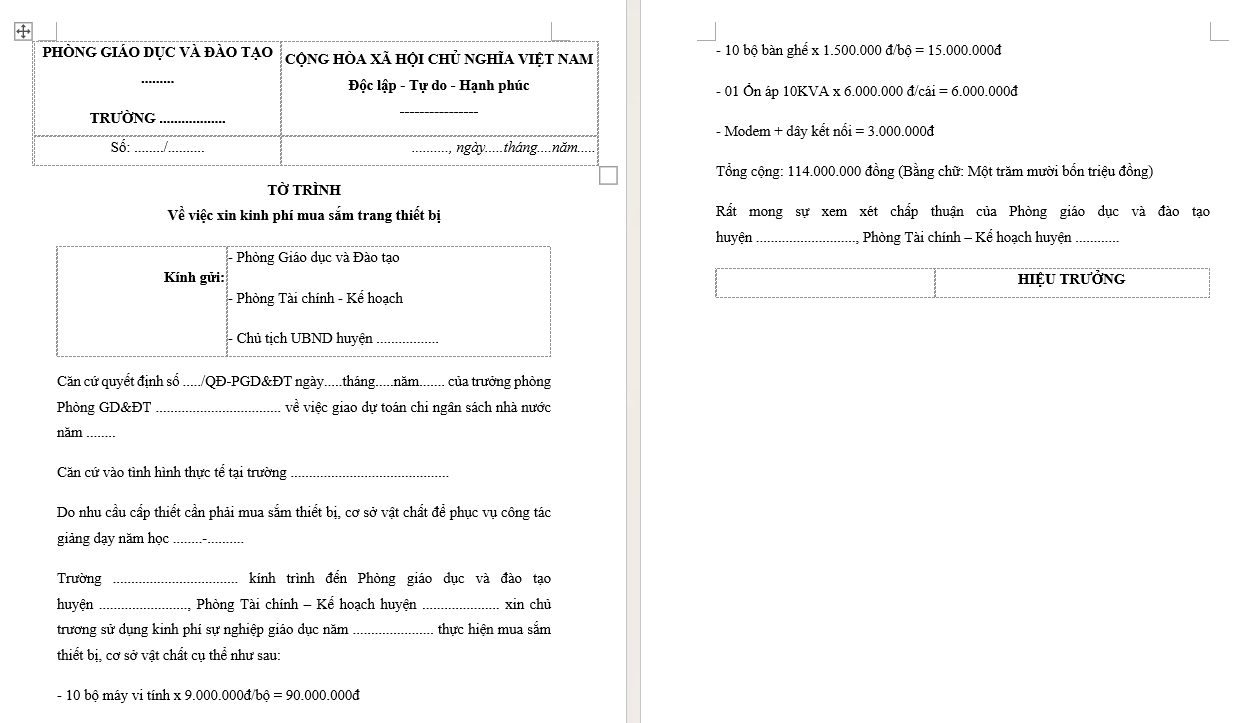 Mẫu tờ trình xin kinh phí mua sắm trang thiết bị là văn bản được sử dụng khi các phòng ban hoặc cá nhân trong doanh nghiệp cần đề xuất mua sắm máy móc, dụng cụ, thiết bị phục vụ công việc. Mẫu tờ trình này thể hiện rõ lý do cần mua sắm, danh mục thiết bị, chi phí dự kiến và lợi ích mang lại cho hoạt động của đơn vị. Thông qua tờ trình, ban lãnh đạo có cơ sở xem xét, phê duyệt và phân bổ ngân sách phù hợp.