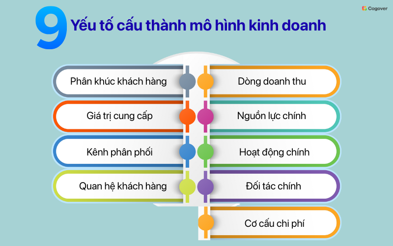 Trong thực tế, một mô hình kinh doanh hoàn chỉnh thường gồm 9 yếu tố cốt lõi theo khung Business Model Canvas. Khung này giúp doanh nghiệp hệ thống hóa toàn bộ hoạt động, từ khách hàng, giá trị cung cấp đến vận hành và tài chính.