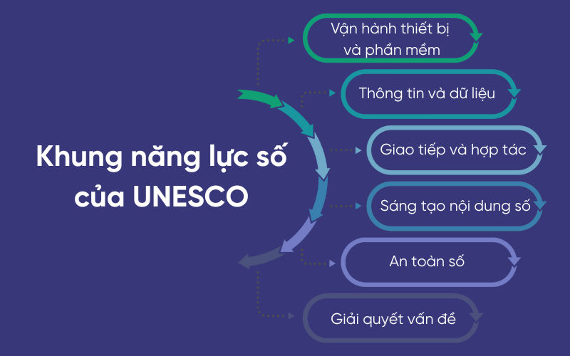Khung năng lực số của UNESCO được xây dựng nhằm trang bị năng lực số toàn diện cho học sinh, sinh viên và giáo viên, giúp họ vừa hiểu vừa vận dụng công nghệ trong học tập, nghiên cứu và giao tiếp. Khung này không chỉ tập trung vào kiến thức mà còn nhấn mạnh kỹ năng thực hành và thái độ sử dụng công nghệ một cách hiệu quả và an toàn.