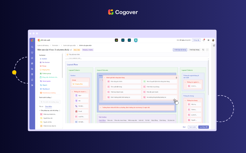 Người dùng nên có thể tự thiết kế giao diện nhập liệu, form tạo bản ghi mới, và giao diện xem/sửa thông tin chỉ bằng thao tác kéo-thả. Các tính năng quan trọng bao gồm: Layout Builder cho phép chia form thành các section và group, quy tắc giao diện (UI Rules) để ẩn/hiện trường dữ liệu theo điều kiện, kanban board cho pipeline bán hàng, và dashboard tổng quan với các widget tùy chỉnh.