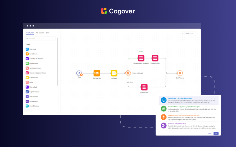 Cogover CRM nổi bật bởi sự kết hợp giữa kiến trúc no-code/low-code 3 tầng (Object Manager — Business Logic — Application) với AI tích hợp sẵn. Nền tảng được thiết kế riêng cho doanh nghiệp Việt Nam, hỗ trợ tiếng Việt hoàn toàn, có khả năng tích hợp với Zalo, Facebook, và các hệ thống HRM, ERP, phần mềm kế toán phổ biến trong nước. Điểm mạnh đặc biệt là BPMN workflow engine mạnh mẽ cho phép thiết kế quy trình nghiệp vụ phức tạp mà không cần code.