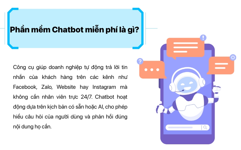 Phần mềm Chatbot là công cụ giúp doanh nghiệp tự động trả lời tin nhắn của khách hàng trên các kênh như Facebook, Zalo, Website hay Instagram mà không cần nhân viên trực 24/7. Chatbot hoạt động dựa trên kịch bản có sẵn hoặc AI, cho phép hiểu câu hỏi của người dùng và phản hồi đúng nội dung họ cần.