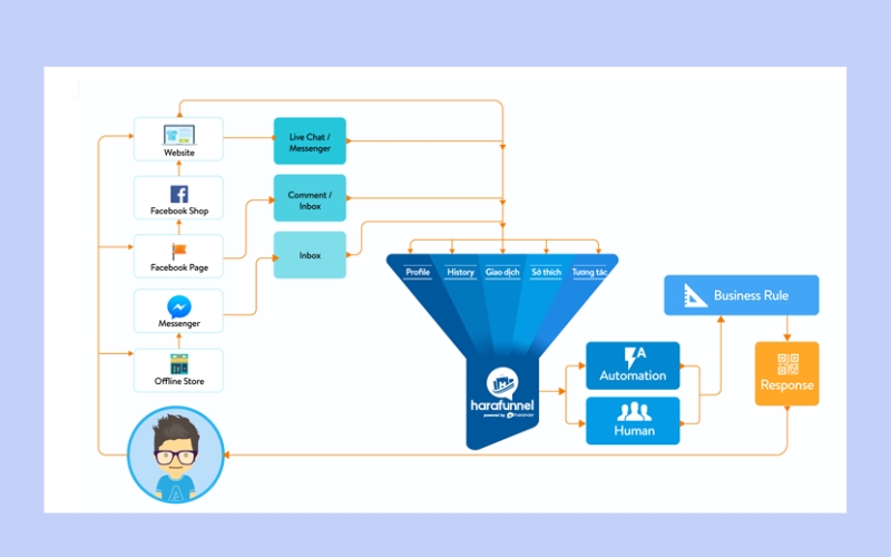 Harafunnel là nền tảng chatbot thuộc hệ sinh thái Haravan, phù hợp với các doanh nghiệp đang dùng Haravan để vận hành bán hàng online. Công cụ này hỗ trợ tự động hóa chăm sóc khách hàng trên Facebook Messenger, đồng thời kết hợp chặt chẽ với hệ thống bán hàng và quản lý đơn của Haravan.