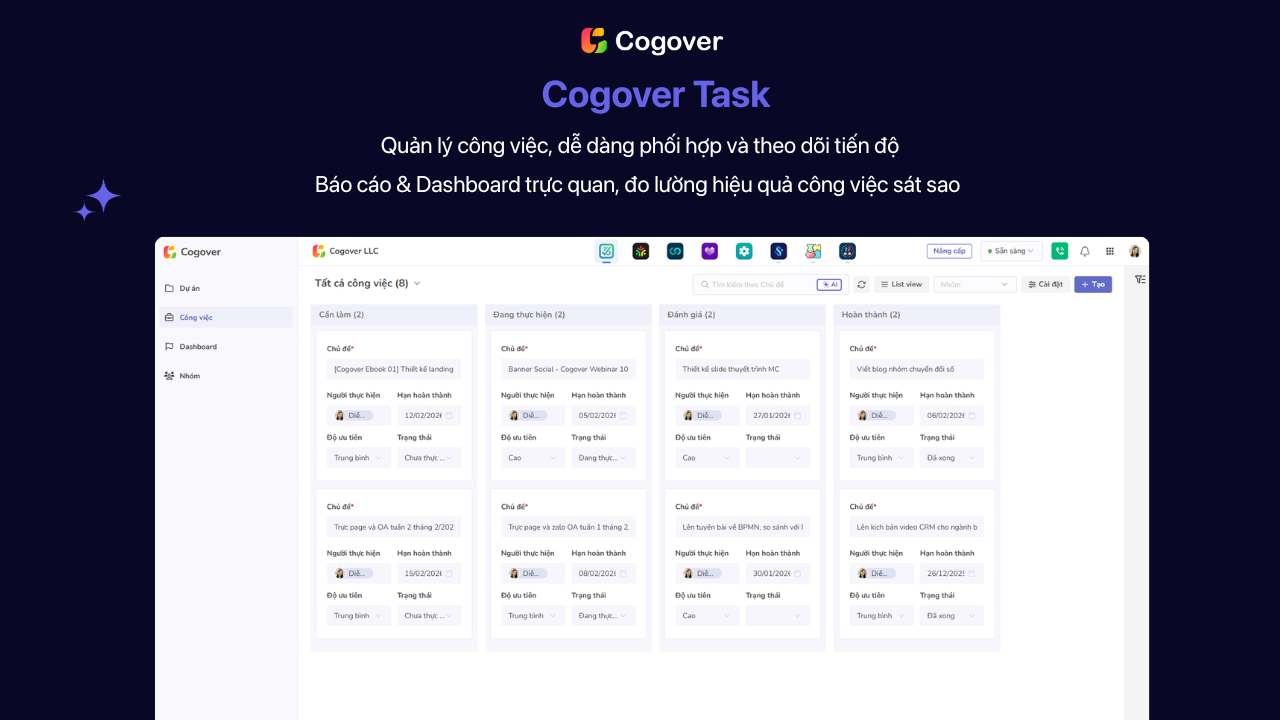 Như vậy, bài viết đã gợi ý các phần mềm quản lý công việc tốt nhất để bạn tham khảo. Nếu doanh nghiệp đang tìm kiếm một nền tảng quản lý công việc tích hợp sâu với CRM, quản lý kho, nhân sự và dịch vụ khách hàng trên cùng một hệ thống, có thể tùy chỉnh hoàn toàn bằng kéo-thả mà không cần lập trình, hãy trải nghiệm Cogover miễn phí tại cogover.com.