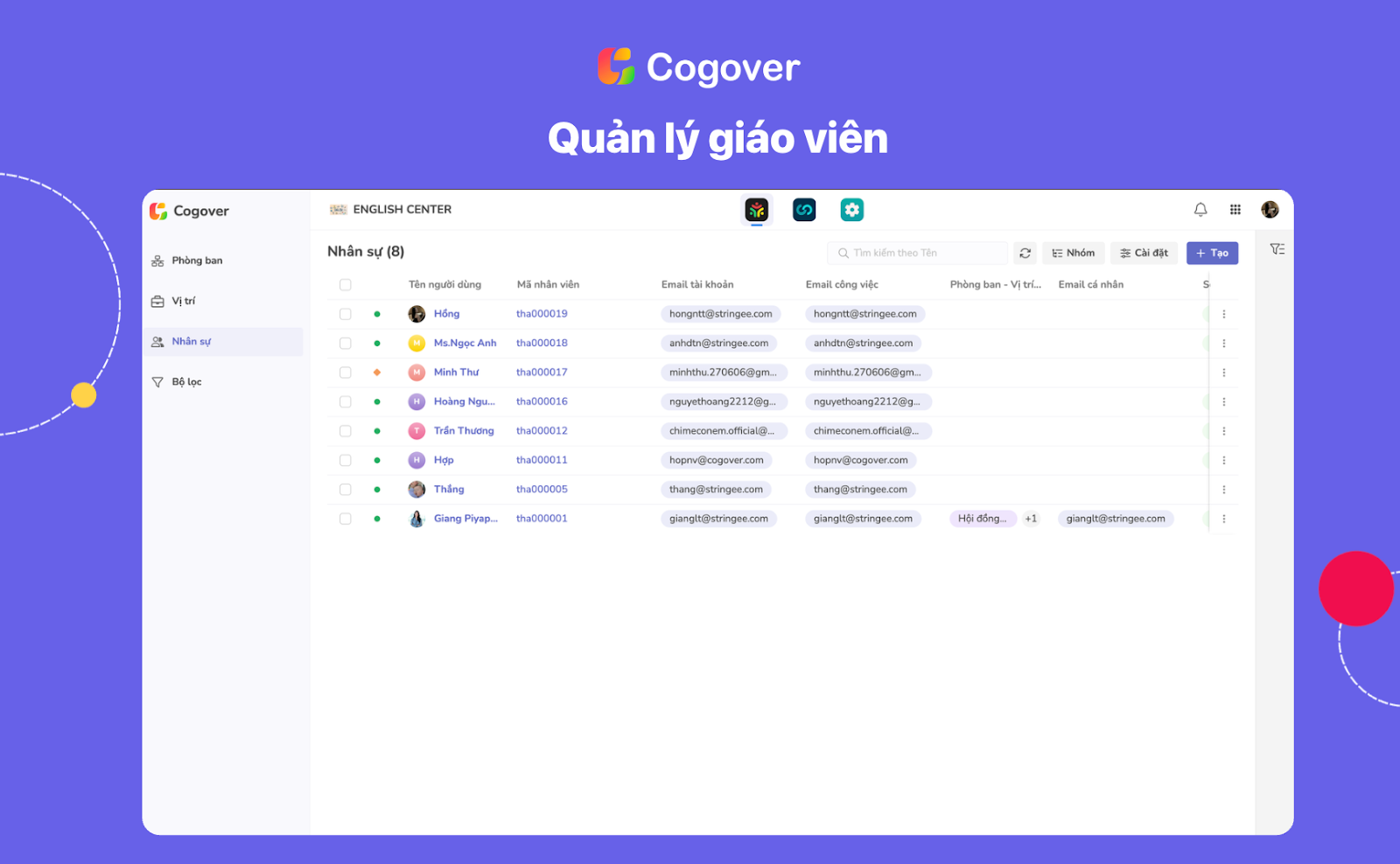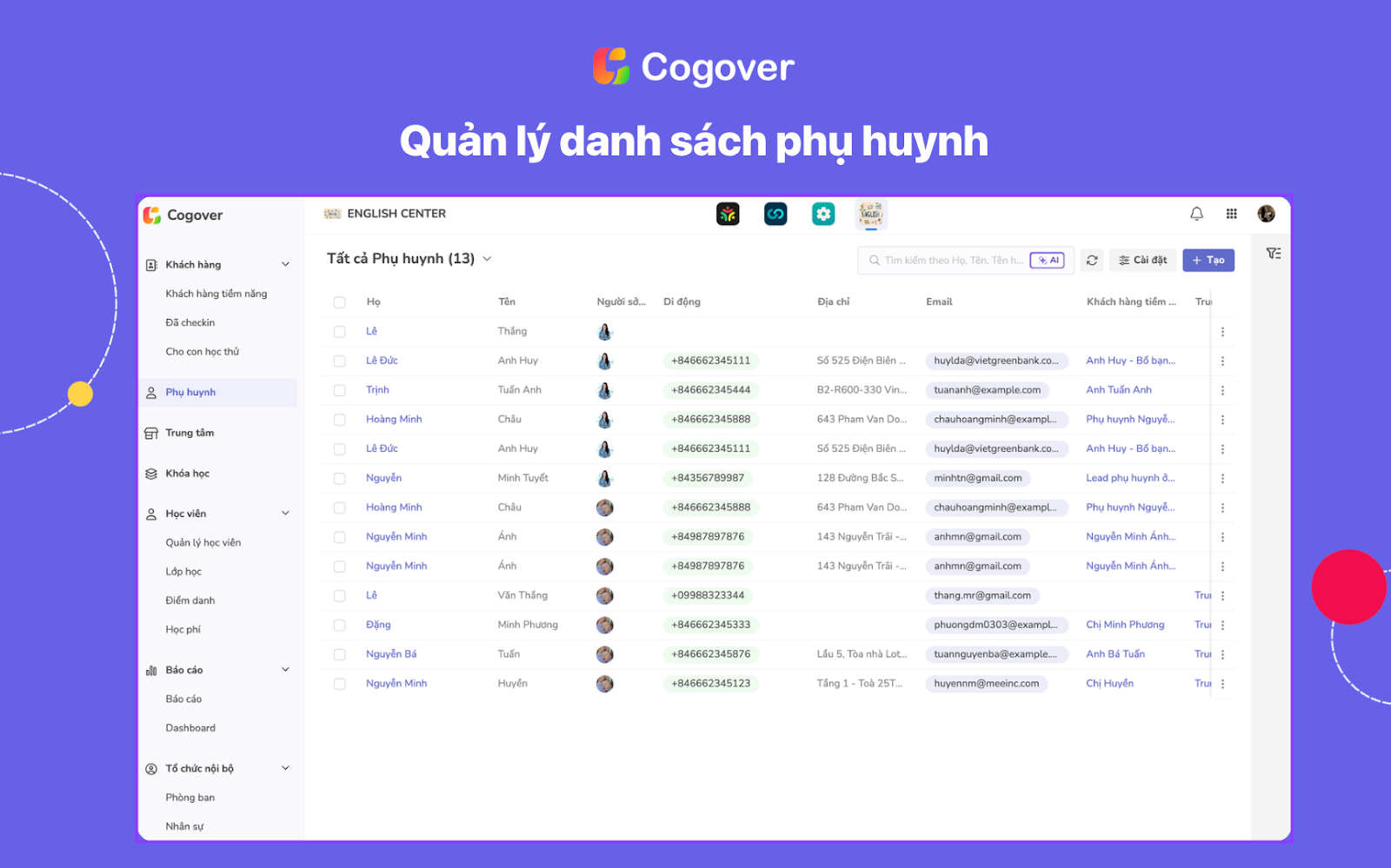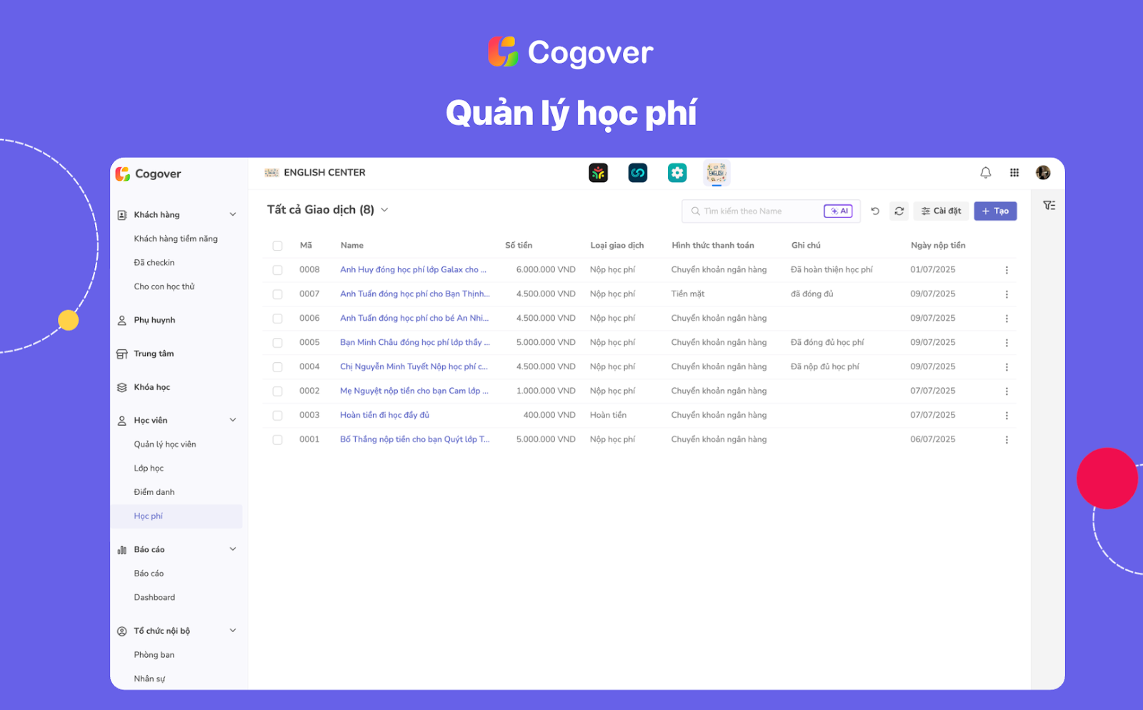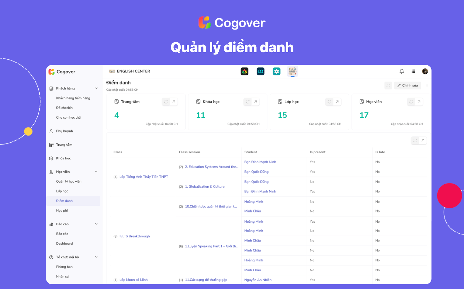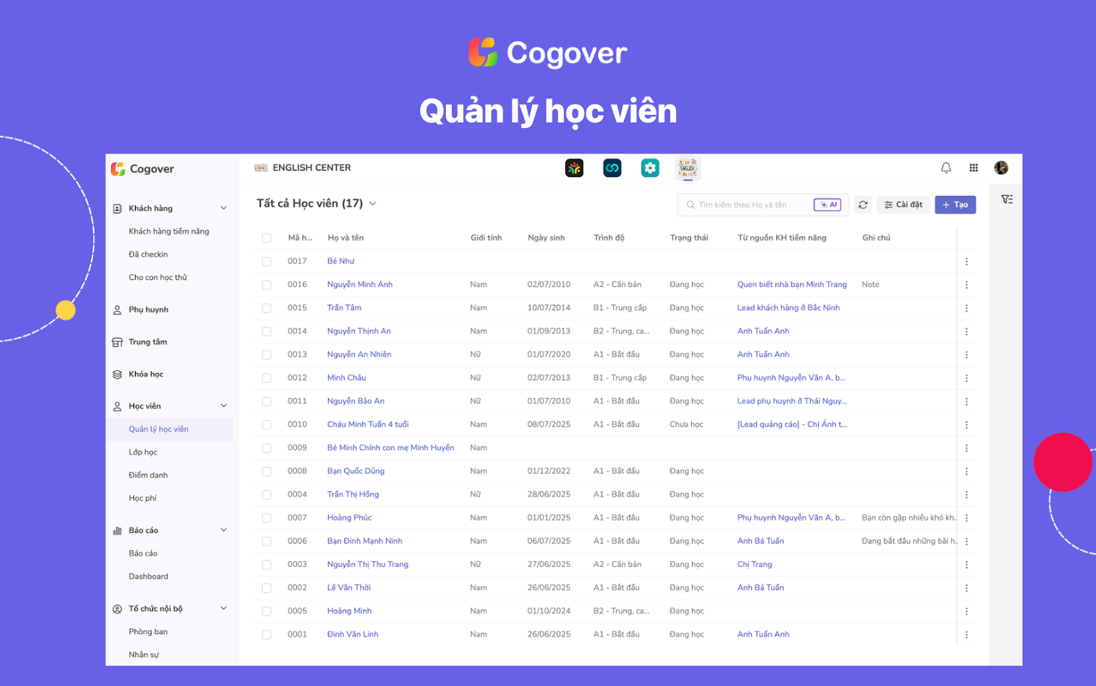 Quản lý học viên: Cogover lưu hồ sơ học viên đầy đủ, bao gồm điểm danh, kết quả kiểm tra, tiến độ theo từng giai đoạn học. Các trung tâm có thể tùy chỉnh lộ trình học và điều kiện chuyển lớp theo mô hình riêng.