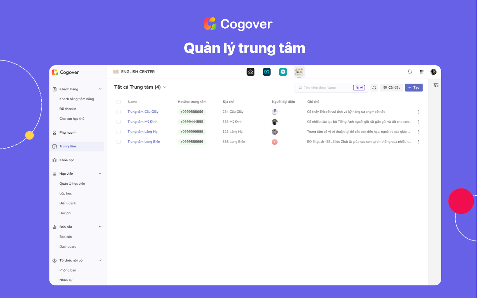 Quản lý các cơ sở của trung tâm: Các chi nhánh được quản lý tập trung nhưng vẫn có phân quyền rõ ràng. Dữ liệu lớp học, giáo viên, học viên và doanh thu từng cơ sở đều được tổng hợp trong một giao diện thống nhất.