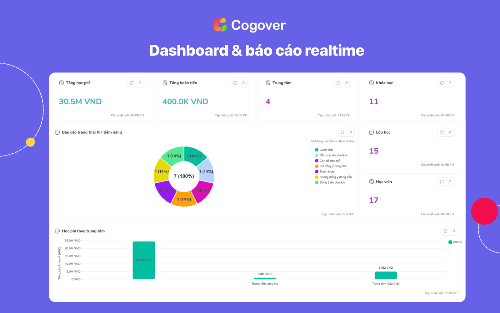 Dashboard và báo cáo realtime: Cogover cung cấp bảng điều khiển trực quan với dữ liệu cập nhật theo thời gian thực. Trung tâm có thể theo dõi tình trạng tuyển sinh, sĩ số lớp, doanh thu, hiệu suất giáo viên và mức độ hoàn thành khóa học mà không cần xuất báo cáo thủ công.