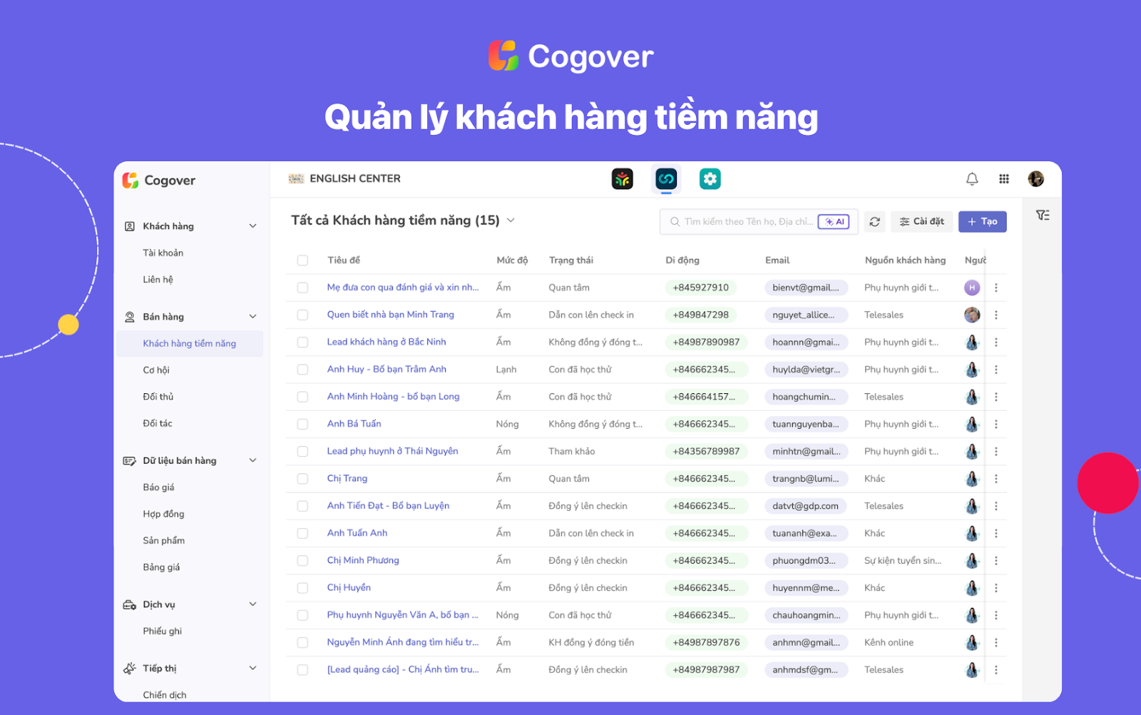 Trong bối cảnh nhiều phần mềm trên thị trường còn hạn chế về khả năng tùy chỉnh, kết nối dữ liệu và tự động hóa, các trung tâm ngoại ngữ bắt đầu tìm kiếm những nền tảng linh hoạt hơn, có thể thích nghi với quy trình đặc thù của từng mô hình đào tạo. Cogover CRM là nền tảng quản trị doanh nghiệp hợp nhất đáp ứng nhu cầu này, cho phép các trung tâm xây dựng quy trình quản lý học viên, lớp học, giáo viên, học phí theo cách riêng mà không phụ thuộc vào cấu trúc cố định của phần mềm đóng gói. Các tính năng nổi bật như sau:
