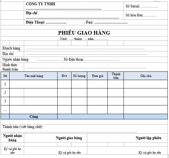 Phiếu giao hàng là chứng từ dùng để xác nhận việc giao nhận hàng hóa giữa bên bán và bên mua. Trên phiếu này ghi rõ thông tin về người giao, người nhận, ngày giờ giao hàng, số lượng, chủng loại, quy cách và tình trạng hàng hóa. Đây là căn cứ quan trọng giúp hai bên kiểm tra, đối chiếu khi có sự cố phát sinh trong quá trình giao nhận.