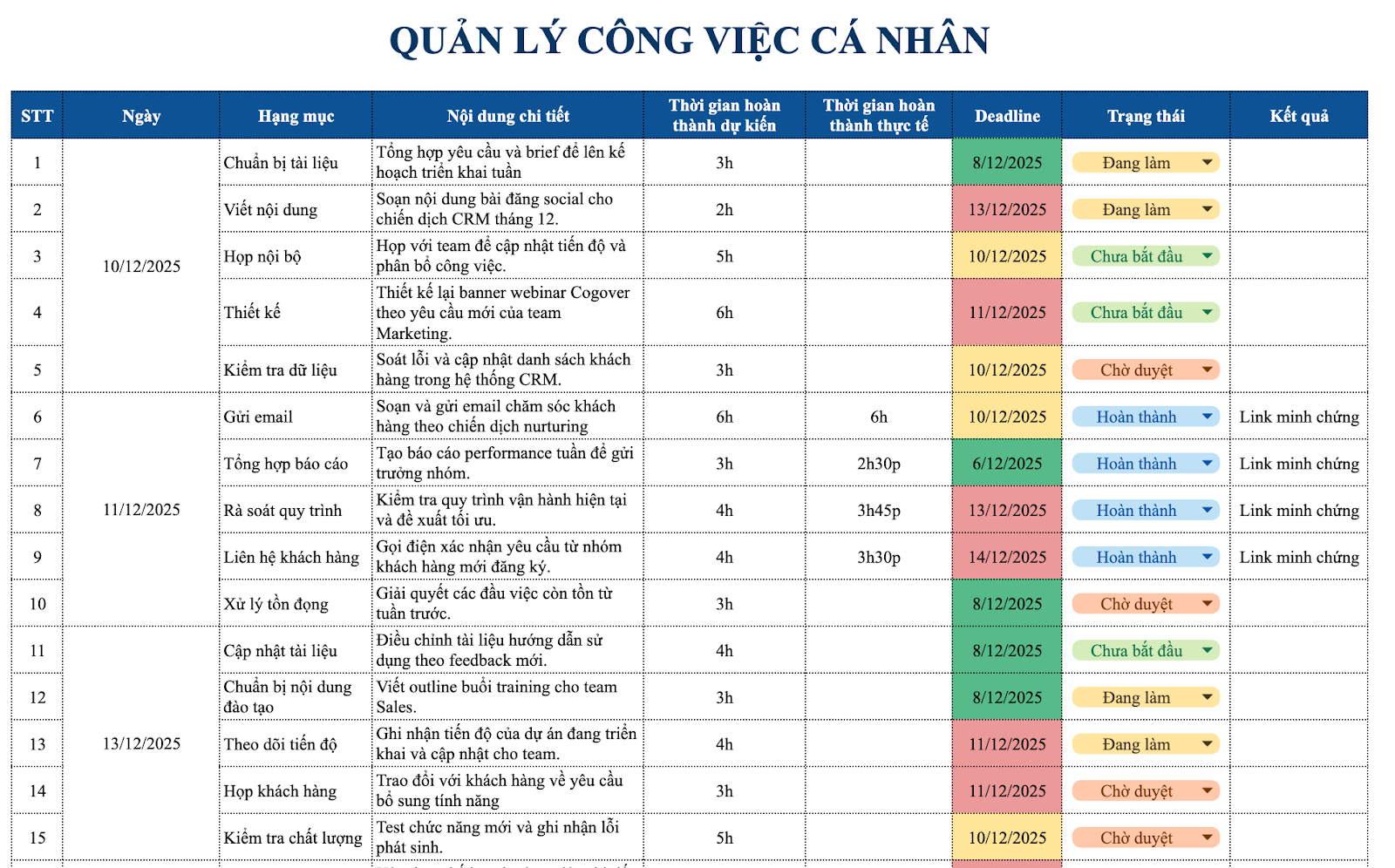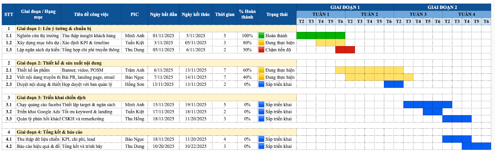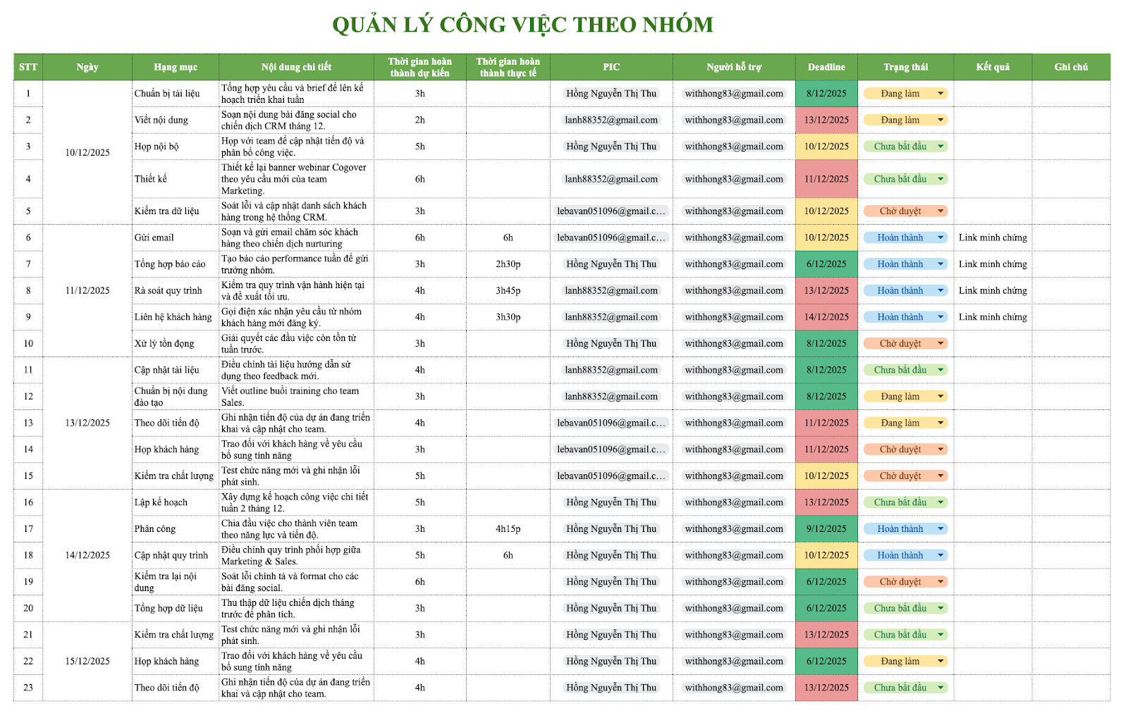 Thiết kế phù hợp với các team nhỏ. Mỗi nhiệm vụ có PIC, thời gian thực hiện, tiến độ %, trạng thái và ghi chú. Màu sắc được phân cấp rõ ràng giúp nhà quản lý nắm bắt nhanh ai đang làm gì. Tại ô PIC và người hỗ trợ, bạn có thể thực hiện thao tác giao việc trực tiếp như đã hướng dẫn tại phần 2.2