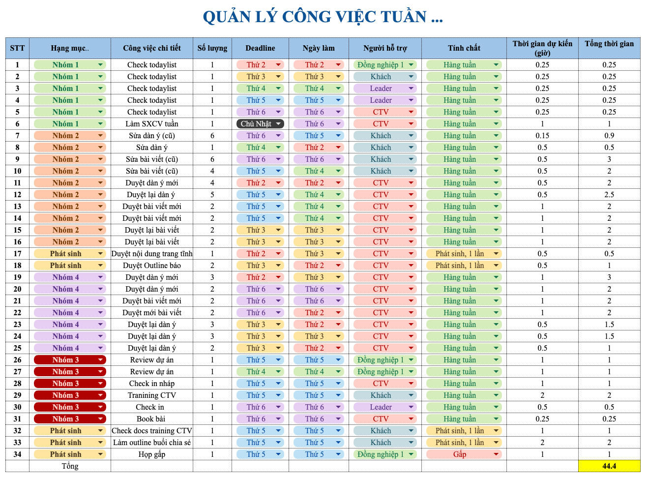 Tổng hợp công việc theo hạng mục, deadline, người thực hiện, tính chất công việc và thời gian dự kiến. Mẫu này dùng nhiều trình thả xuống và biểu tượng giúp bạn quản lý tiến độ công việc hàng tuần một cách khoa học.