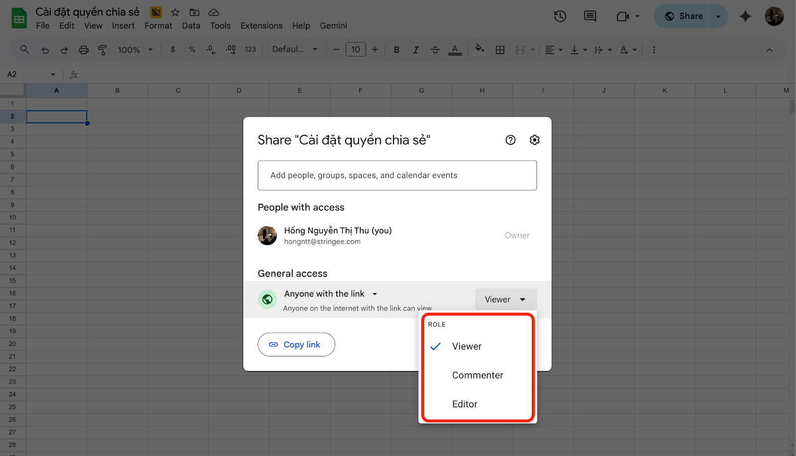 Khi làm việc nhóm, bước quan trọng đầu tiên là thiết lập quyền truy cập cho file Google Sheet. Việc phân quyền rõ ràng giúp hạn chế sai sót dữ liệu và đảm bảo mỗi người chỉ thao tác trong phạm vi phù hợp, đồng thời hỗ trợ theo dõi lịch sử chỉnh sửa khi cần kiểm tra.