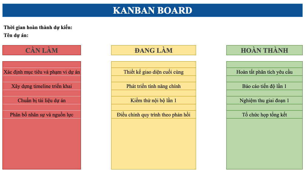 Bảng Kanban ba cột: Cần làm - Đang làm - Hoàn thành. Để thay đổi trạng thái của công việc, bạn chỉ cần copy nội dung và dán sang cột trạng thái phù hợp. Mẫu này phù hợp cho team content, marketing, sản xuất hoặc các công việc cần trực quan hóa quy trình.