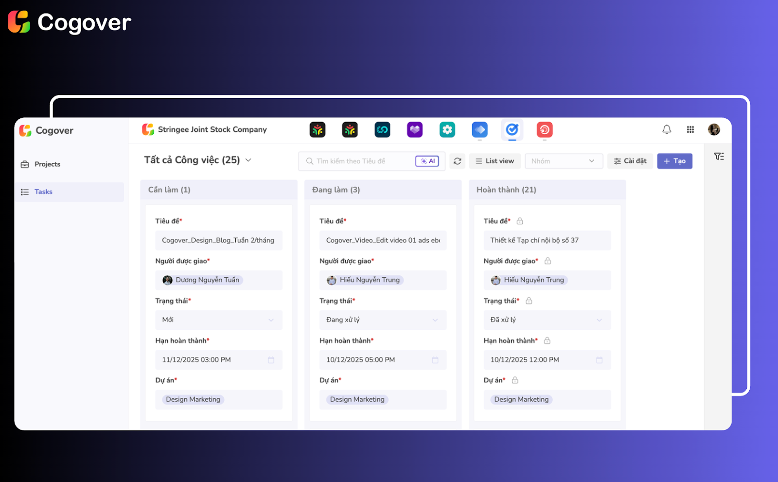 Ngoài ra, Cogover Task còn cung cấp hai chế độ xem linh hoạt: danh sách (list) và Kanban, cho phép người dùng xem toàn bộ danh sách công việc và thực hiện thao tác kéo thả giữa các cột trạng thái. Nhờ đó, việc quản lý tiến độ trở nên trực quan, minh bạch và dễ vận hành hơn nhiều so với file bảng tính.