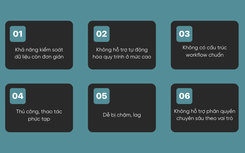 Ngoài ra, Google Sheet không có cấu trúc workflow chuẩn, nên khó quản lý các quy trình nhiều bước, phê duyệt đa cấp hoặc phối hợp liên phòng ban. Khi dữ liệu mở rộng, bảng sheet thường trở nên nặng, khó đọc và khó duy trì sự nhất quán.