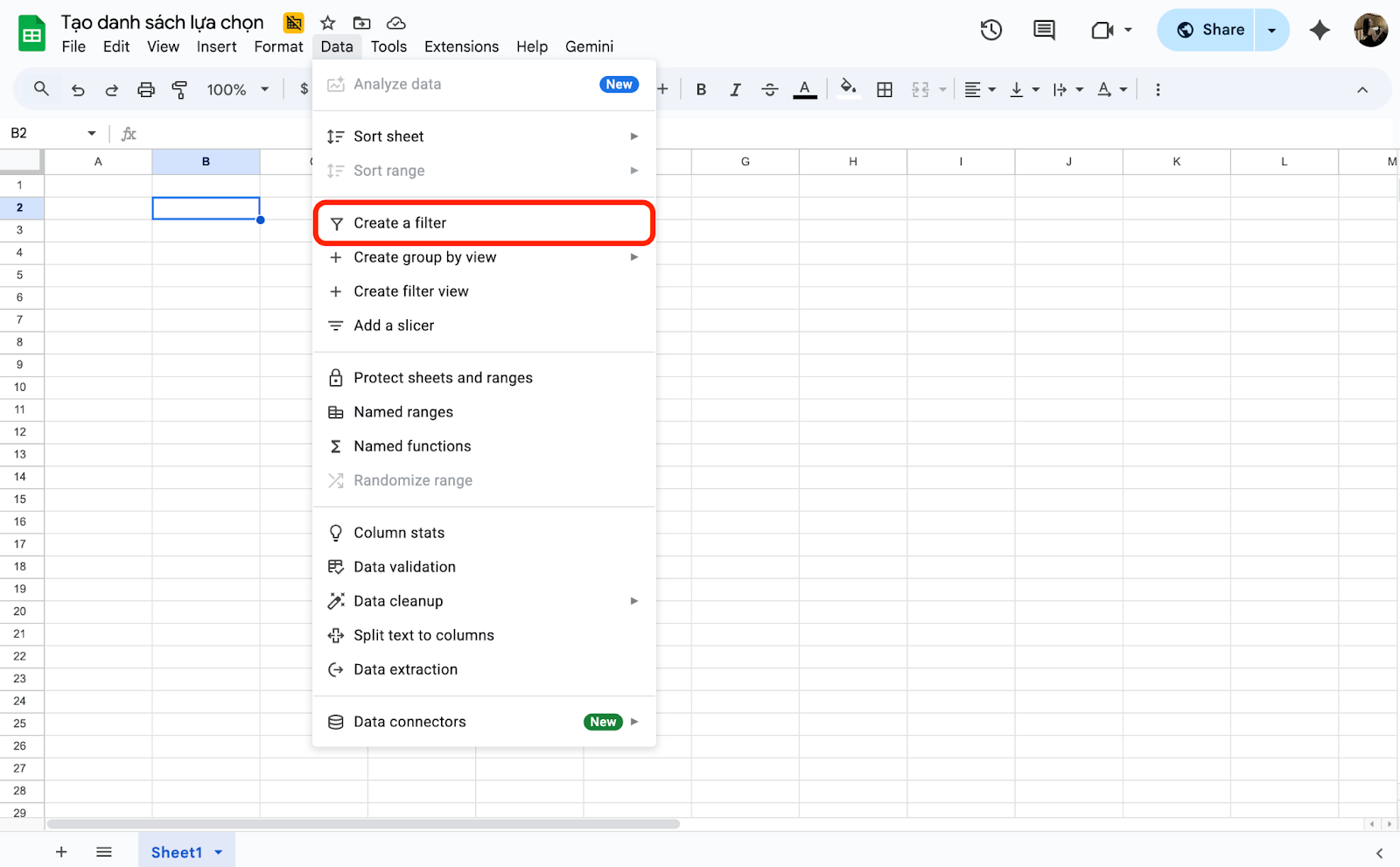 Với tính năng Sort và Filter, bạn có thể xem nhanh các công việc theo mức độ ưu tiên, người phụ trách hoặc deadline. Điều này đặc biệt hữu ích khi lượng công việc lớn, cần phân loại để ra quyết định nhanh. Google Sheet cũng cho phép tạo bộ lọc riêng cho từng người dùng mà không ảnh hưởng đến cả đội nhóm.