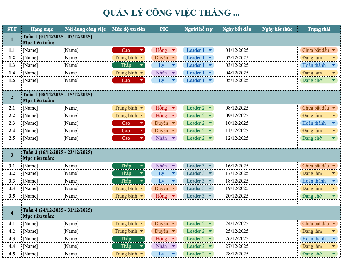 Bảng công việc chia theo các tuần trong tháng, có phần mục tiêu tuần, mức độ ưu tiên, trạng thái và người phụ trách. Mẫu phù hợp cho team marketing, kinh doanh hoặc vận hành cần theo dõi công việc theo chu kỳ dài hơn.