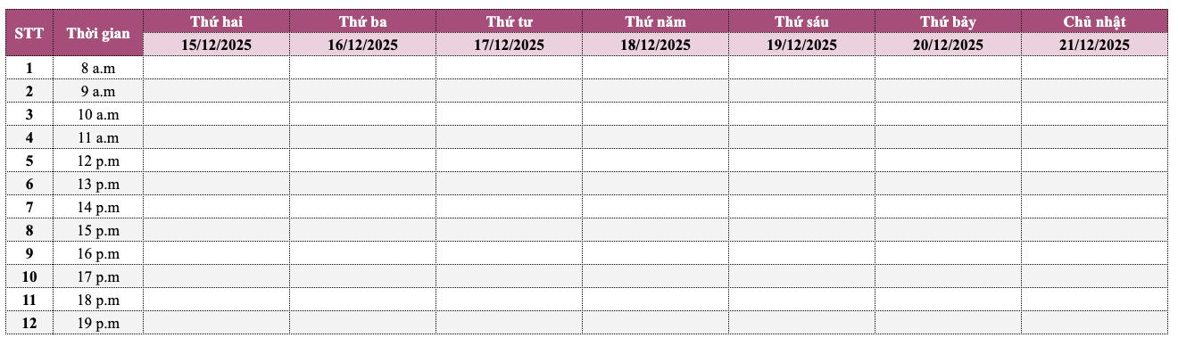 Dạng bảng lịch tuần, chia theo từng ngày và từng khung giờ giúp bạn lập lịch họp, lịch làm việc cá nhân hoặc thời khóa biểu chi tiết. Phù hợp cho những ai cần theo dõi công việc theo từng mốc thời gian trong ngày.
