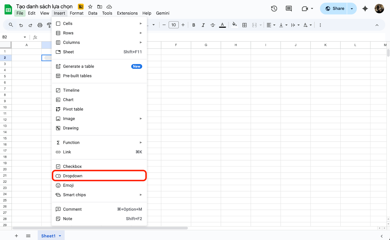 Để quản lý công việc gọn gàng hơn, bạn có thể tạo danh sách dạng thả xuống (drop-down) bằng tính năng Data Validation. Danh sách chọn sẵn giúp thông tin nhất quán và dễ lọc dữ liệu hơn khi phân tích.