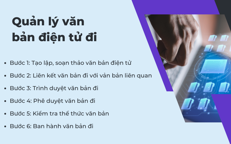 Quản lý văn bản điện tử đi là quá trình tạo lập, phê duyệt, ban hành và theo dõi các văn bản do tổ chức phát hành ra bên ngoài. Quy trình này giúp đảm bảo văn bản được soạn thảo đúng thể thức, phê duyệt đúng thẩm quyền và ban hành kịp thời, đồng thời dễ dàng kiểm soát, tra cứu về sau.