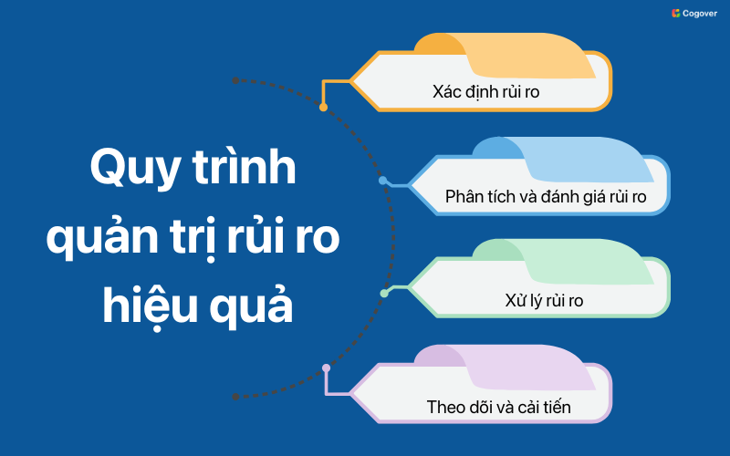 Quản trị rủi ro là một quy trình liên tục giúp doanh nghiệp nhận diện, đánh giá, kiểm soát và cải thiện các mối nguy tiềm ẩn, đảm bảo hoạt động ổn định và phát triển bền vững. Một quy trình quản trị rủi ro hiệu quả thường gồm 4 bước cơ bản: