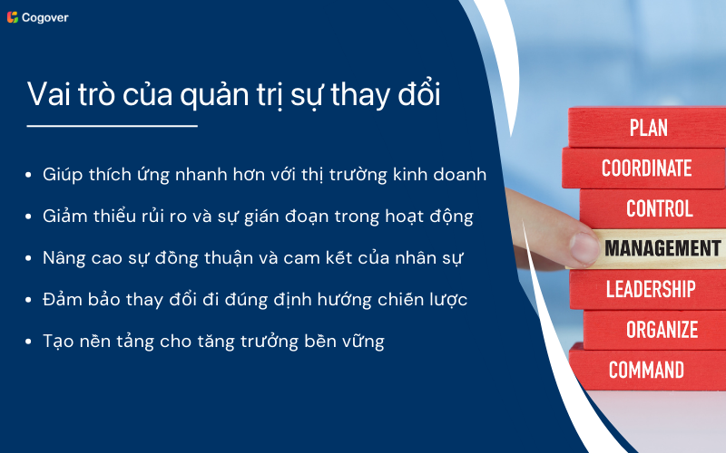Quản trị sự thay đổi đóng vai trò quan trọng trong việc giúp doanh nghiệp kiểm soát và triển khai các hoạt động chuyển đổi một cách hiệu quả. Dưới đây là một số vai trò mà quản trị sự thay đổi mang lại cho doanh nghiệp: