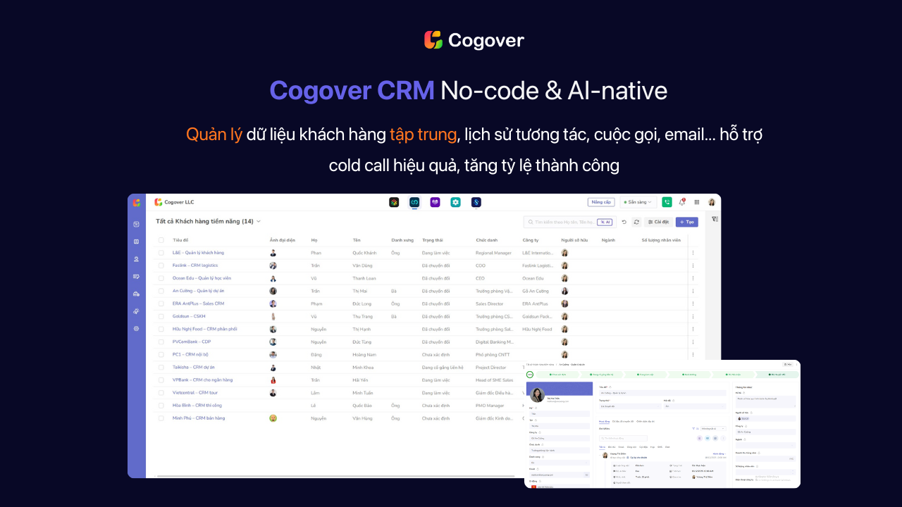 Với định hướng CRM thế hệ mới No-code/AI-native, Cogover CRM giúp quá trình thay đổi trở nên nhẹ nhàng và dễ tiếp cận hơn: