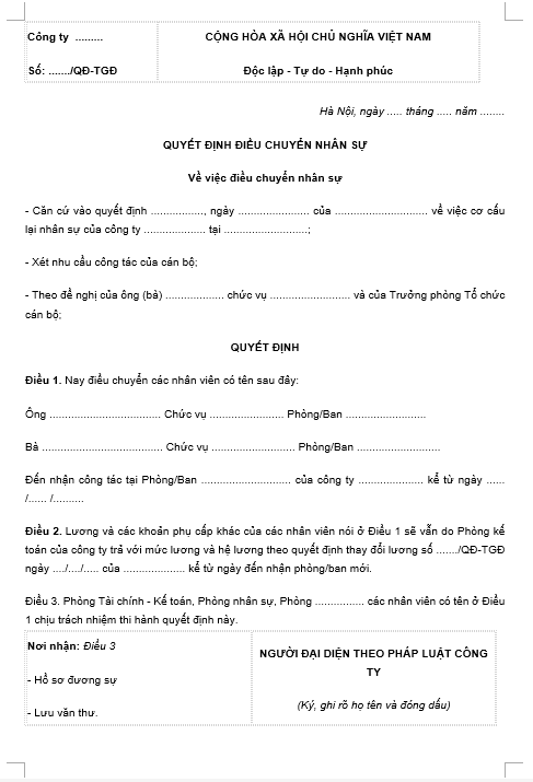 Dưới đây là mẫu quyết định điều chuyển nhân sự mà bạn có thể tải về và sử dụng ngay: