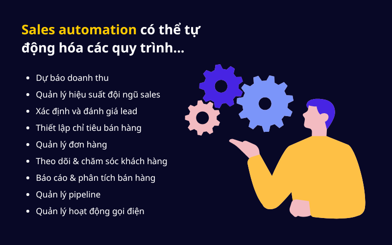 Các nền tảng sales automation hiện nay có thể hỗ trợ tự động hóa nhiều nghiệp vụ quan trọng trong quy trình bán hàng, bao gồm nhưng không giới hạn: