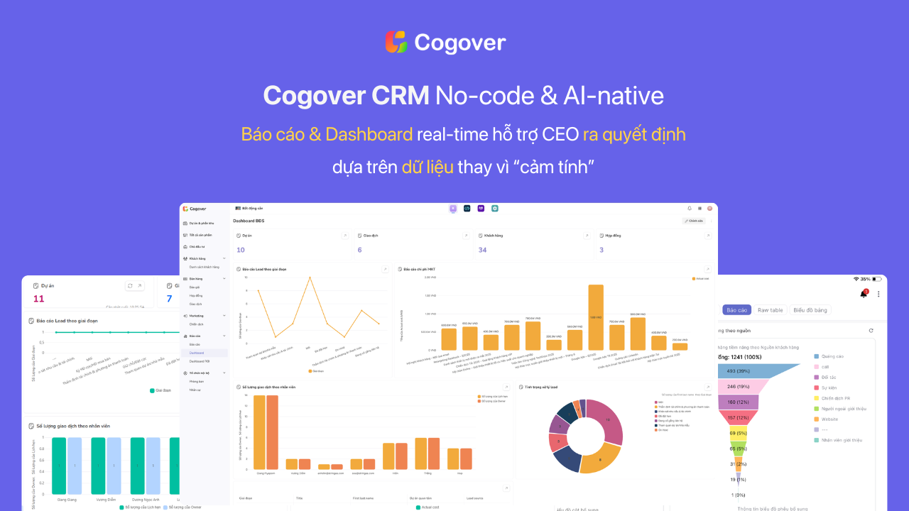 Cogover CRM cho phép xây dựng các dashboard và báo cáo tùy chỉnh theo vai trò: sales, quản lý bán hàng và C-level. Dữ liệu được cập nhật realtime từ hệ thống, giúp lãnh đạo nắm bắt nhanh tình hình kinh doanh, dự báo doanh thu và nhận diện các điểm nghẽn trong sales funnel mà không cần chờ báo cáo thủ công.