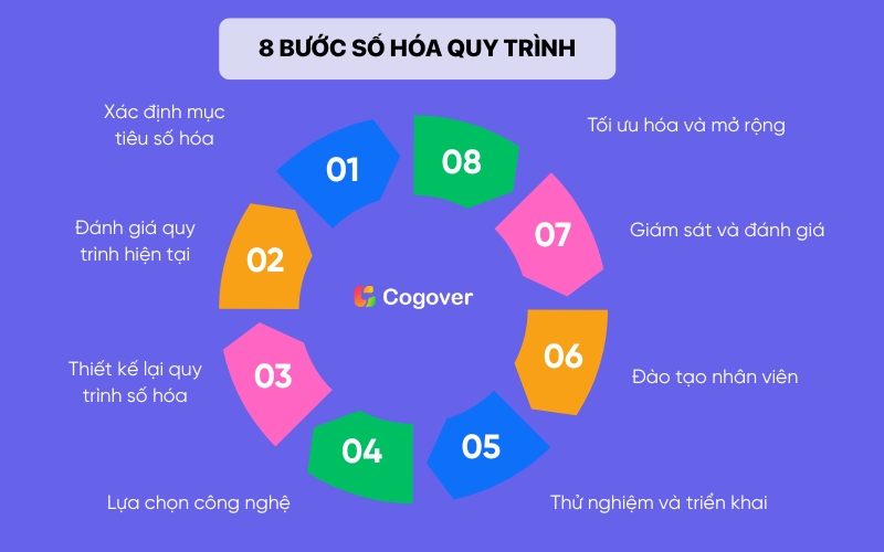 Để số hóa quy trình mang lại hiệu quả thực chất, doanh nghiệp cần triển khai theo một lộ trình rõ ràng, có tính kế thừa và kiểm soát. Dưới đây là 8 bước triển khai chuẩn, thực tiễn áp dụng trong doanh nghiệp Việt Nam.