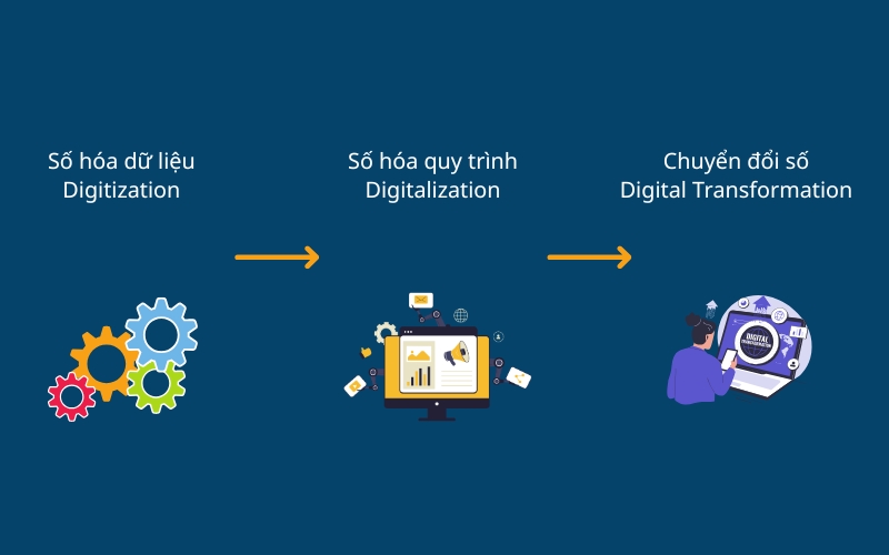 Nhiều doanh nghiệp hiện nay vẫn nhầm lẫn giữa ba khái niệm: số hóa dữ liệu (digitization), số hóa quy trình (digitalization) và chuyển đổi số (digital transformation). Trên thực tế, đây là ba cấp độ liên quan chặt chẽ nhưng hoàn toàn khác nhau, trong đó “số hóa dữ liệu” là nền tảng ban đầu, “số hóa quy trình” là bước phát triển ở tầng vận hành, và “chuyển đổi số” là đích đến chiến lược ở cấp độ toàn doanh nghiệp.