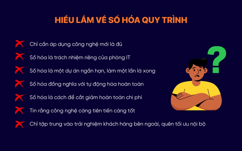 Trong quá trình triển khai số hóa quy trình, nhiều doanh nghiệp thường gặp phải những hiểu lầm khiến dự án không đạt kết quả như mong muốn, thậm chí thất bại ngay từ giai đoạn đầu. Dưới đây là những sai lầm phổ biến nhất và phân tích chi tiết để doanh nghiệp nhận diện, tránh mắc phải khi thực hiện lộ trình số hóa.