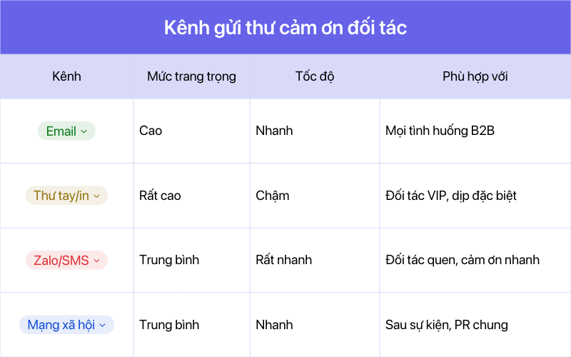 Việc lựa chọn kênh gửi thư cảm ơn đối tác phù hợp sẽ giúp thông điệp được tiếp nhận tốt nhất. Mỗi kênh có ưu và nhược điểm riêng, phù hợp với từng tình huống và mức độ trang trọng khác nhau.