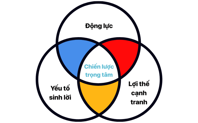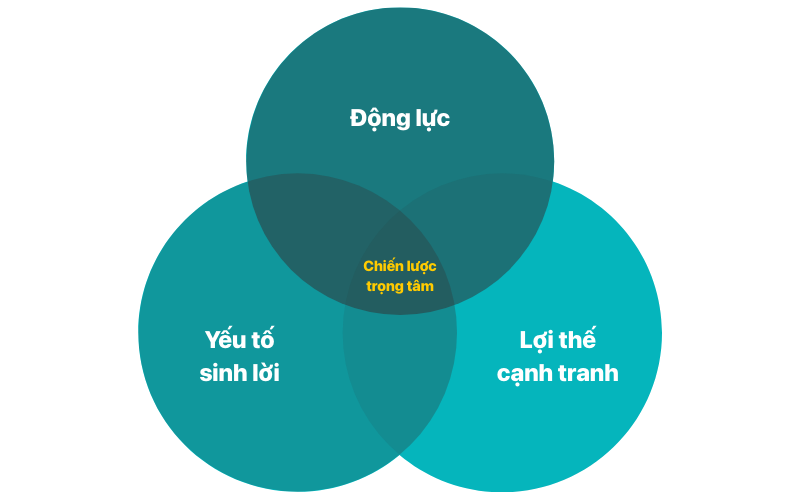 Trọng tâm chiến lược của doanh nghiệp nằm ở điểm giao của ba yếu tố: động lực nội tại, lợi thế cạnh tranh và khả năng sinh lợi. Đây là lĩnh vực mà doanh nghiệp nên ưu tiên tập trung nguồn lực để tạo ra hiệu quả và tăng trưởng bền vững.